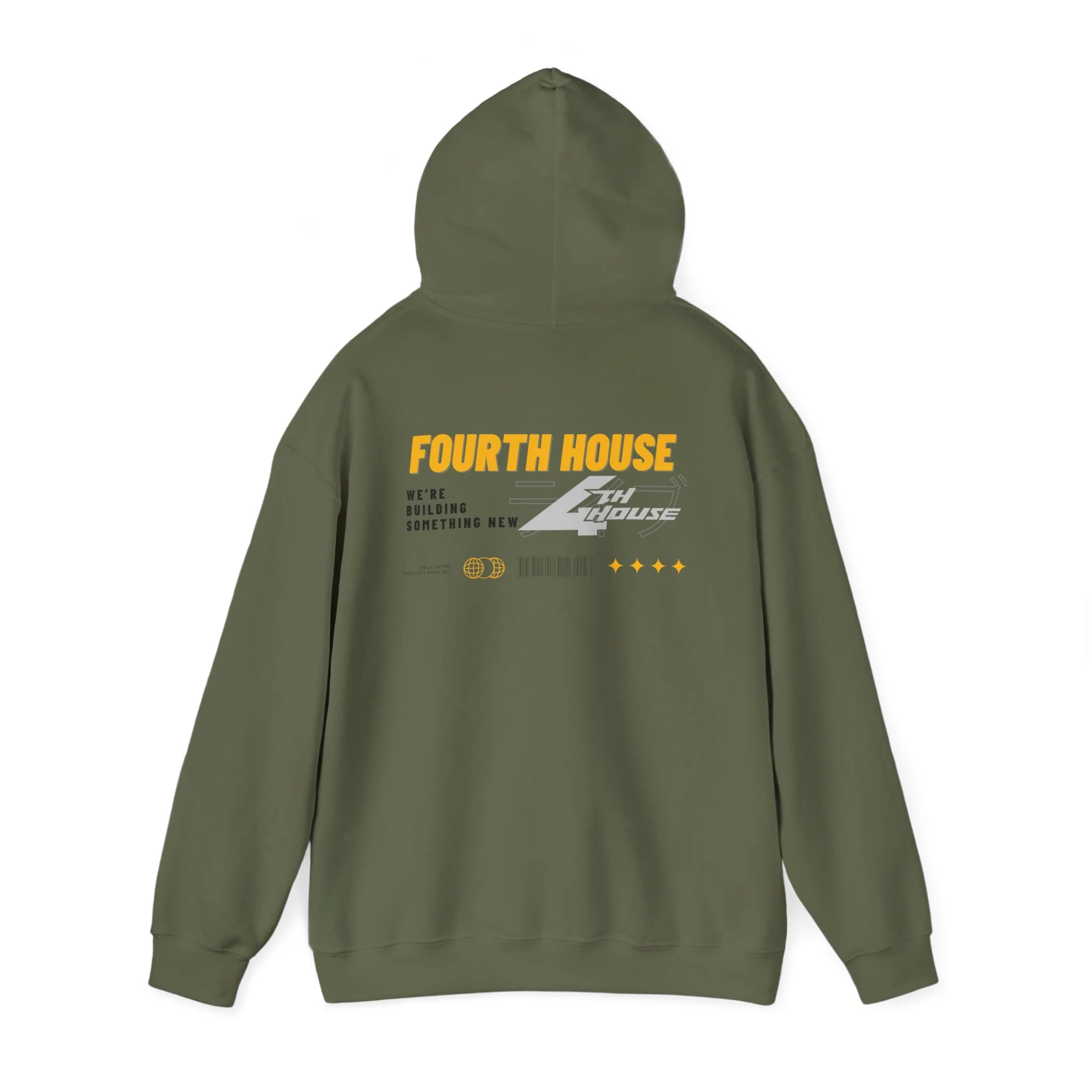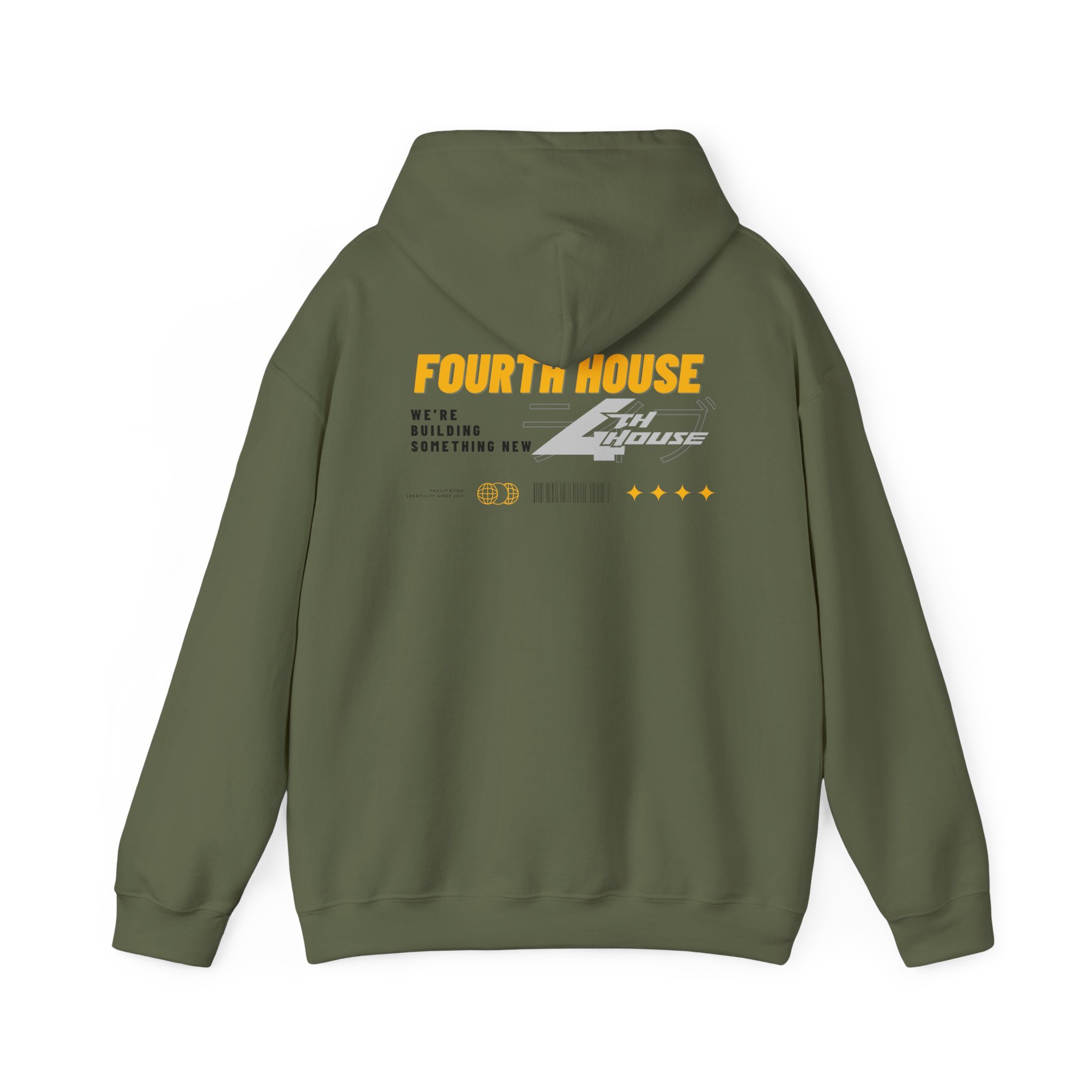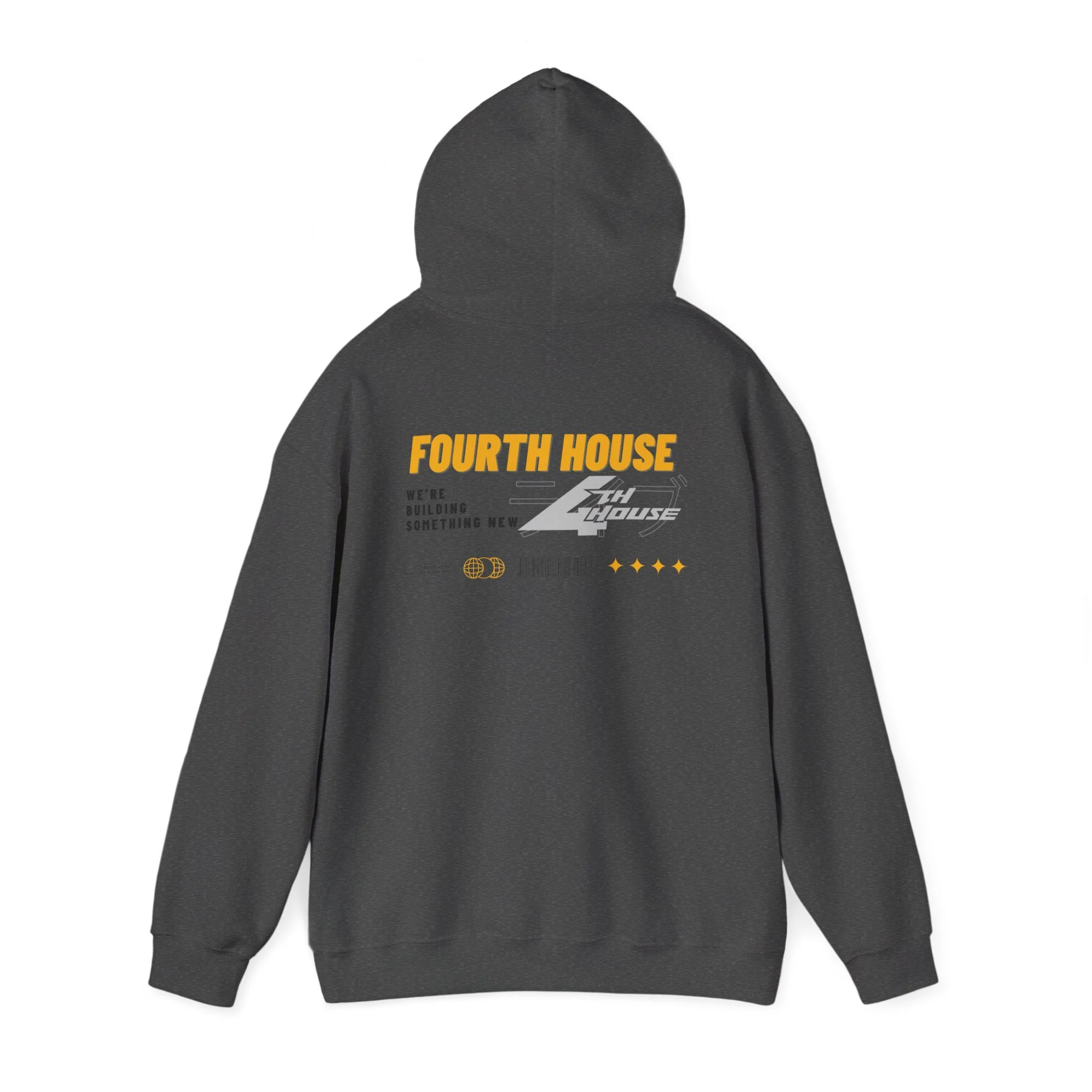 This hoodie carries a low-key, workshop-ready vibe — black fleece with bold yellow and gray graphics that read “FOURTH HOUSE” on the back and a compact badge on the chest. It feels like the sweatshirt you pull on for late-night builds, garage sessions, or meetups with folks who like to tinker. The roomy hood, kangaroo pocket, and soft midweight blend keep you warm without weighing you down. Subtle sleeve and wrist detailing add a custom, crafted touch that makes the piece feel built, not bought.